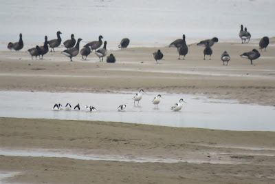 Also seen in the surrounding hedgerows were a single Firecrest, a Siskin and a Chiffchaff with at least 25 Long-tailed Tits in one flock. In the harbour a single Red-breasted Merganser and the Barnacle Goose that flew over a couple of times. In the field west of the church yard the lone Pale-bellied Brent was still with around 800+ Dark-bellied Brents (see attached photo). With the tide pushing up, the waders included 5 Bar-tailed Godwits, 8 Knot and single Sanderling roosting on the iron jetty. A single Sandwich Tern plus a dashing Kingfisher were also present. (BFF)