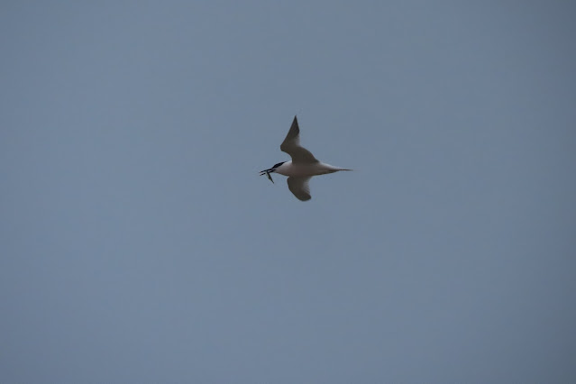 Later on, there were just a handful of Dunlin present, plus four Whimbrels, but the harbour was busy with both Sandwich Terns and Little Terns displaying, fish-passing and mating, with up to 20 of the latter sitting out on the mud, waiting for a suitor to bring a fish. (AH)