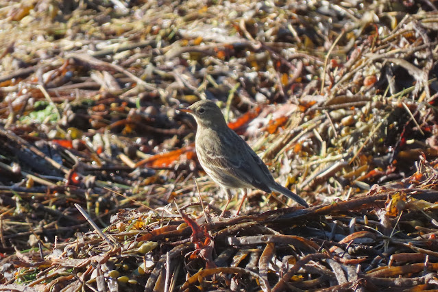 Two more Rock Pipits and three Meadow Pipits were further along the spit, and there were more Dunlin, along with 180 Oystercatchers out on the islands, but in the harbour at high water there were just the usual Brent Geese, Wigeon, Teal, Pintail and Great Crested Grebes. (LP)