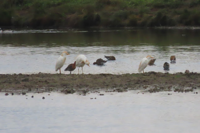 Thee were also three Cattle Egrets on the pool early on, and the two Spotted Redshanks and the Greenshank, along with a dozen Redshanks and a pair of Shelducks with eight well-grown juveniles, were in the channel opposite. (AH/IP/RP et al)