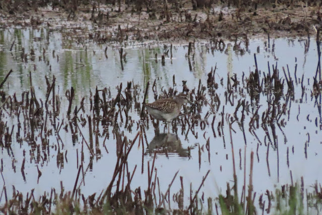 Mill Pond Marsh: The Wood Sandpiper was back on the field this morning, along with a Greenshank, a Common Sandpiper, a Lapwing, three Black-tailed Godwits, six Teal, a Grey Heron and four Little Egrets. (MO-W/AH/RJS/CS et al)