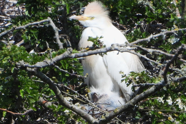 A look from the other end this morning found just 14 Shelducks in the harbour,, and along the reeds a few Sedge Warblers, Reed Warblers and Cetti’s Warblers, with a Linnet, a couple of Chiffchaffs, five Whitethroats and a Blackcap along the hedges, and it was busy at Owl Copse with the young Grey Herons growing daily, and most of the Cattle Egret nests also have chicks now.